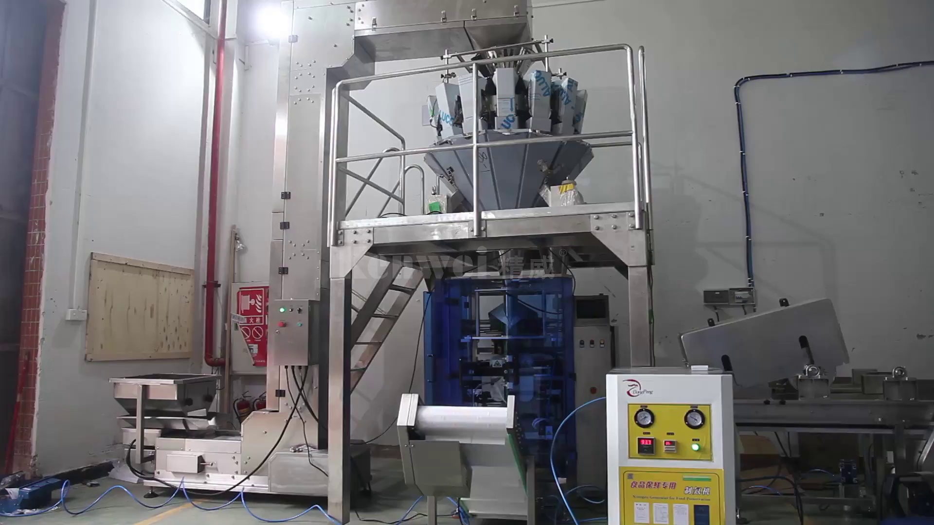 The video highlights a complete Kenwei automatic packing machine food system, showcasing its seamless integration of various stages, from product feeding and weighing to bag forming, filling, and sealing. This integrated system eliminates manual labor at almost every stage, drastically improving throughput and lowering the risk of human error. The heart of the system lies in its sophisticated multi-head weigher, which accurately measures portions, ensuring consistent weight in every package.