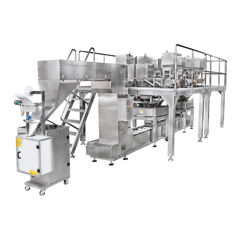 The standard no-spring combination scale features a patented spring-free hopper design, making it ideal for weighing a variety of products such as melon seeds, peanuts, nuts, almonds, grapes, candies, pistachios, potato chips, shrimp chips, and more. The double-support feeding tray is easily adjustable, while the feeding hopper is designed for easy disassembly, ensuring convenience and cleanliness. With a maximum weighing speed of up to 120 bags per minute, the 14-head standard no-spring combination scale is an economical, versatile, and cost-effective solution.